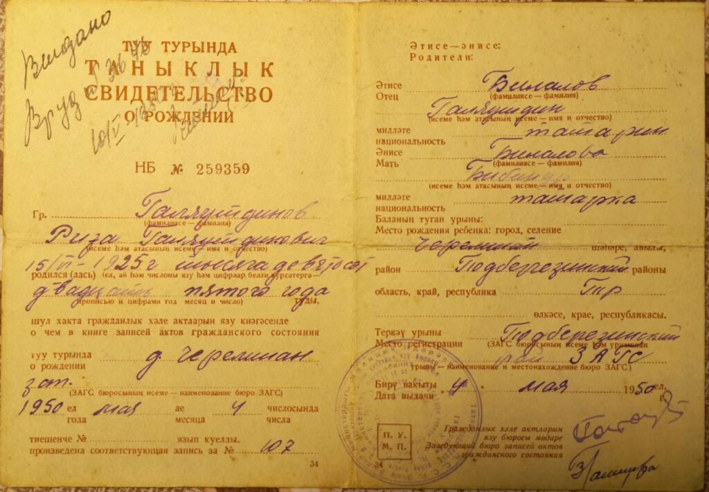 Родился: 15 июня 1925 г. в дер. Черемшан (Кайбицкий район, Татарская АССР)